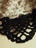 オフホワイトと黒の毛糸にラメ糸を混ぜた、パイナップル編みのショールです。