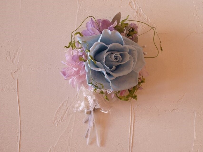 メインに使用しているそら色のバラは、花弁を一枚一枚丁寧に開き、満開のお花に仕上げました。バラの周りに透明感のある紫のアジサイや淡いグリーンのツタをからめた軽やかな雰囲気のコサージュです。