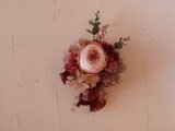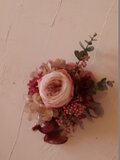 メインには幾重にも重なった花弁がギュッと詰まってコロンとした形が可愛いオールドローズを使用しました。中心はショコラブラウン色で大人な雰囲気のローズにワインレッドのレースなどをあわせて、落ち着いた雰囲気のコサージュです。