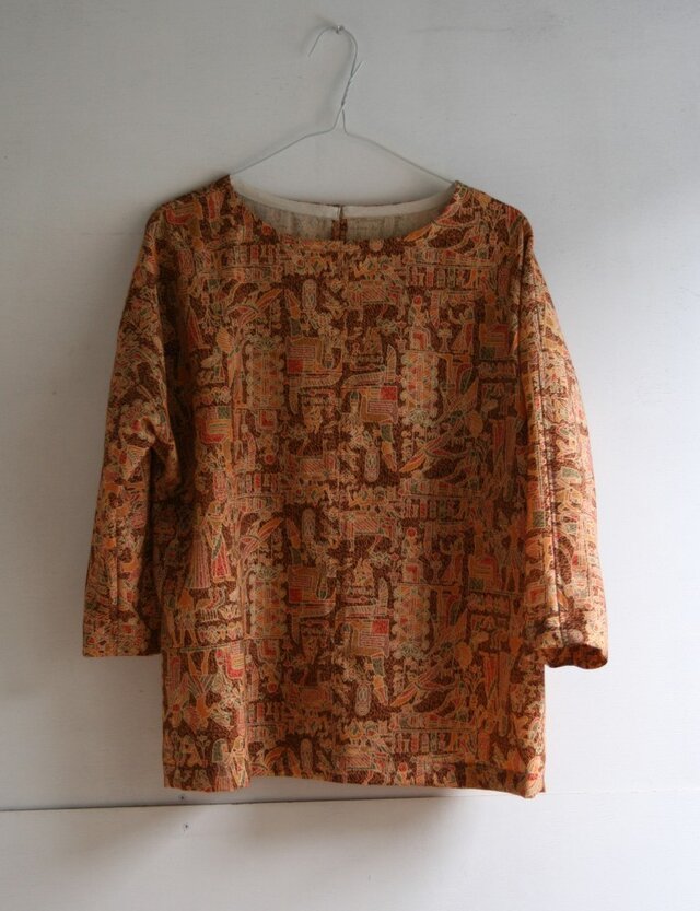 エジプトの壁画が個性的なウール地です。薄手のタートルネックのカットソーと合わせて着ていただくのがお勧めです。
