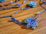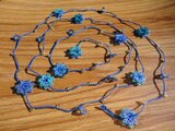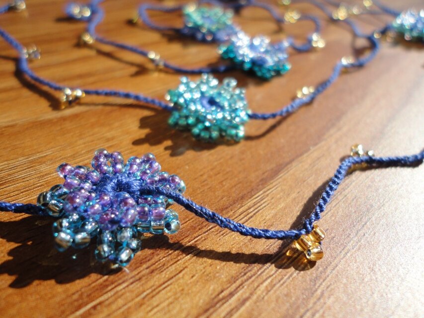 ビーズと綿100%の糸を使用している為、付心地も軽やかです。花のモチーフを10個編み込んでいますが、様々な青色のビーズを使用していますので、一つ一つモチーフの表情が違います。