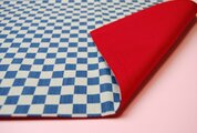 藍染生地を使用したランチョンマットです。裏面には赤のコットンツイルを縫い合わせています。サイズは縦33cm×横43cm、国内工場で縫製された商品です。洋食器のみならず和食器にも映え、また玄関先のシューズボックスの上やコーヒーテーブル等で小物をディスプレイする敷物としても用いていただける汎用性の高い一品です。