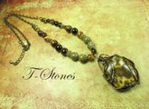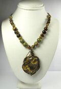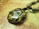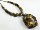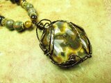 とてもミステリアスで芸術的な模様のオービキュラージャスパーのタンブルを、アンティークゴールドのワイヤーで巻きました。