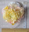 ラナンキュラスはライトイエローで 花びらのふちに 少し濃いめのピンクも入っています。ラナンキュラスのバックには ピンクやオレンジ、レモン色の花びらをそえました。ブローチピンがついています。