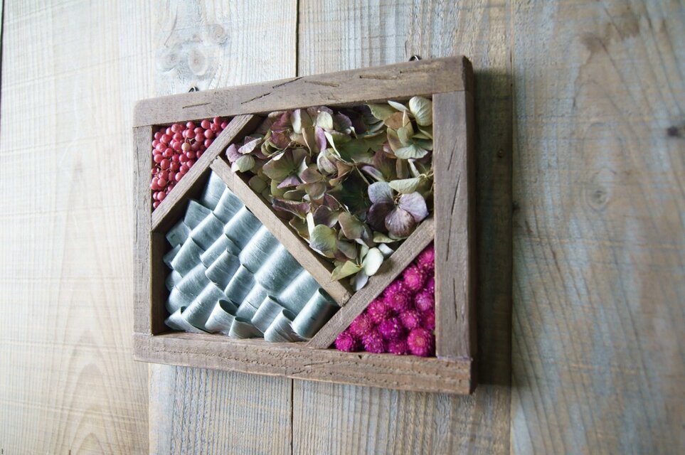 アンティーク調に仕上げた自家製フレームにドライフラワーのペッパーベリー、アジサイ、センニチコウとプリザーブドグリーンのシルバーリーフを貼り付けました。