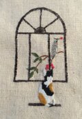 新緑の季節にぴったりな緑色のスカートが届いております 細い糸でこれでもかと思えるほど繊細なハルジオンの白い花、菜の花なずなの白い花が生き生き元気に春を喜んでるみたいです 可愛らしいカラスノエンドウ、清々しく青い空に似合う忘れな草までキジトラ猫さんを遊んでくれているようです♪ 美しすぎる作品を、しばし飾って眺めたいです