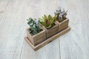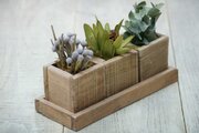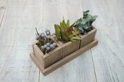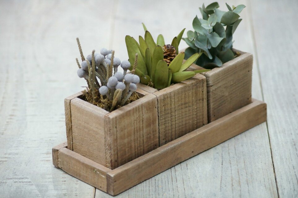 自家製ウッドプランターにナチュラルドライフラワー(ブルニア、ユーカリ、リュウカデンドロン)を詰め込みました。