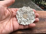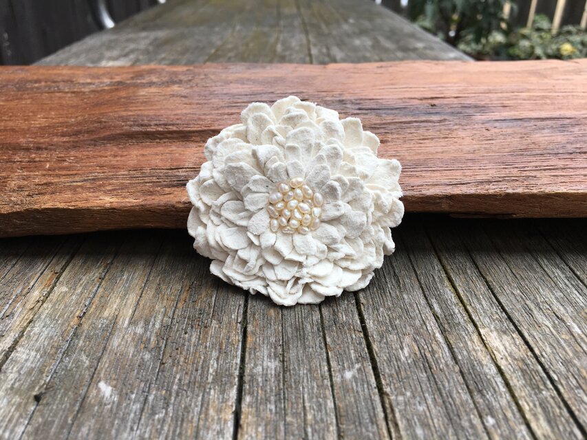 LSPサイズの花びらに、ナチュラルカラーの味のある不揃いな淡水パールを花芯として、ひとつひとつ丁寧にテグスで縫い付けて、ちょっと上品なかんじです。