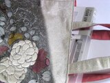 表地は白い絹糸刺繍の艶が綺麗な名古屋帯、内袋は濃いピンク地にドット模様の織地の正絹色無地着物からのリメイクです。