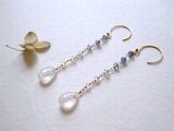 雫シリーズ、今度は「月」をイメージしたピアスです。アイオライト・アクアマリン・ムーンストーンとグラデーションに煌めくボタン石が並び、先にはレインボーに輝く白い月のようなムーンストーンが一石ぶらさがっています。夜空から明るくなっていく月をイメージしました。メイン石のレインボームーンストーンは形も虹色の輝きもとても美しいです。ファンタジックで大人っぽいピアスになりました。※こちらはかなり長めになります。