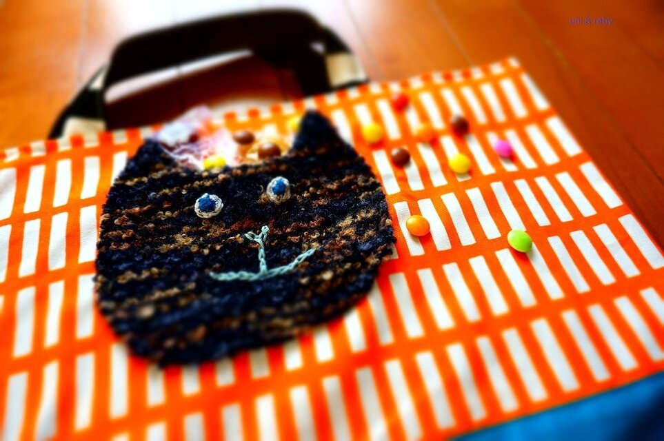 手作業で心を込めて、ネコの顔を刺繍してます。