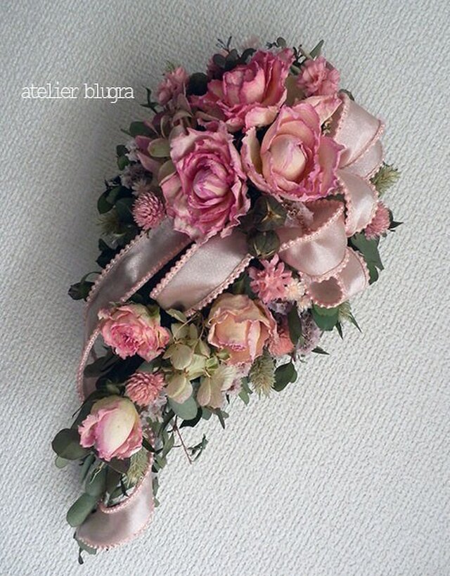 控えめで上品な色のピンク薔薇とユーカリのキャスケードスワッグです。