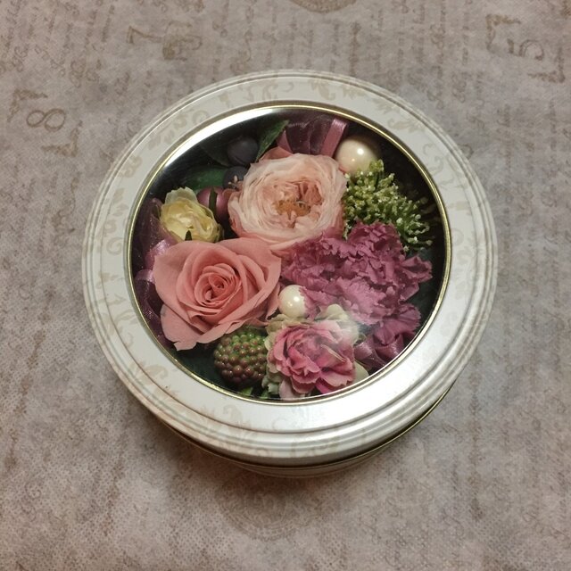 プリザーブドフラワーのてまりミルフィーユとマルーンピンクのローズ、カーネーションを囲むようにアートフラワーのローズ、ベリー、パールピック、リボンで華やかに仕上げました。