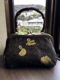 前回と同じ時代帯でがま口手提げを作りました。口金部分のサイズは同じですが、手が竹でできています。デザイン自体もマチの広いぷっくりとした手提げになっています。