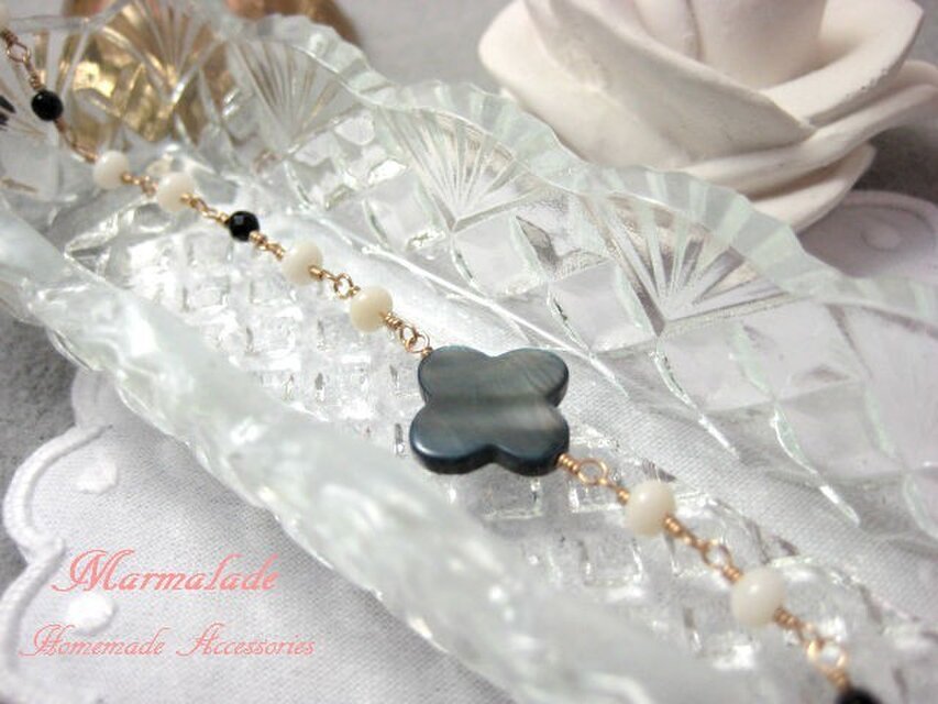 【素 材】シェル(お花の形のもの、直径約1.5cm)・ホワイトコーラル・オニキス・引き輪(14kgf)・エンドパーツ(14kgf)