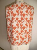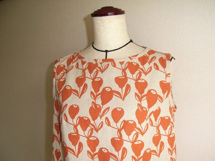 布地はリネンと綿の混紡でオレンジ色のプリント地です。(日本製リネン50%・綿50%)しっかりとした生地なのでほとんど透けないと思います。