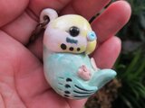 仰向けポーズでまるまるコロッとしたセキセイインコのペンダントです。