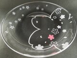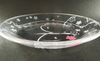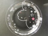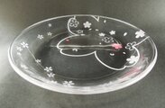 透明のガラスのお皿に、表裏両面から桜の花を散りばめました。裏面はしっかり削り、表面は軽く削り表情をもたせています。