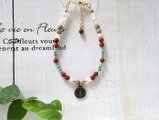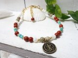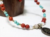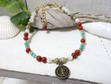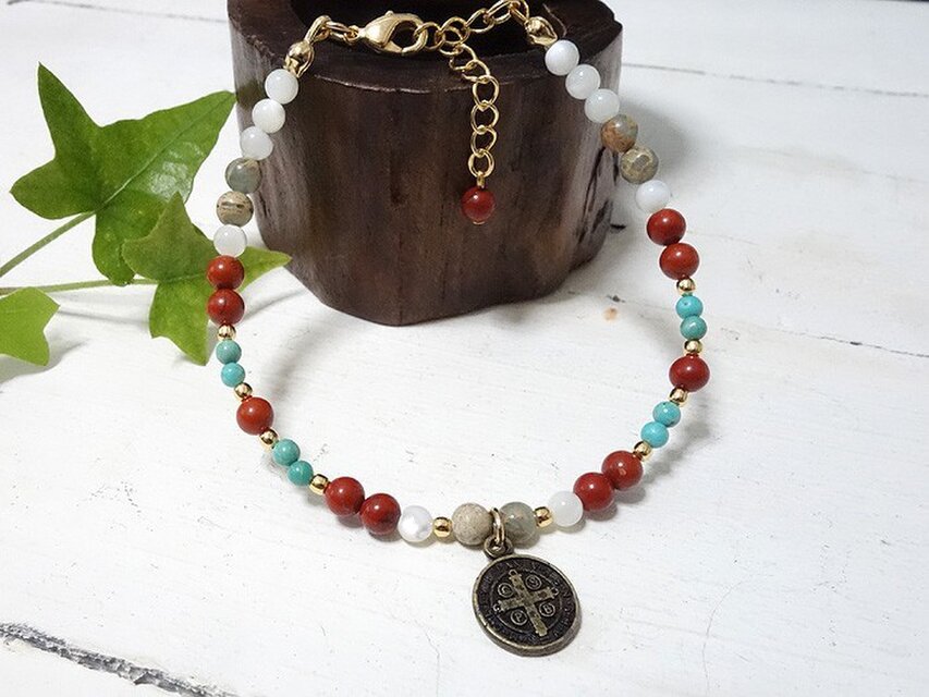 聖ベネディクトのメダイをモチーフにしたチャームをアクセントに、小粒の天然色のターコイズ、レッドジャスパー、マザーオブパール、インプレッションストーンを組み合わせた、カラフルな天然石ブレスレットです。