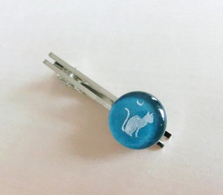 三日月ネコを描いた絵を、樹脂で閉じ込めたネクタイピンです。