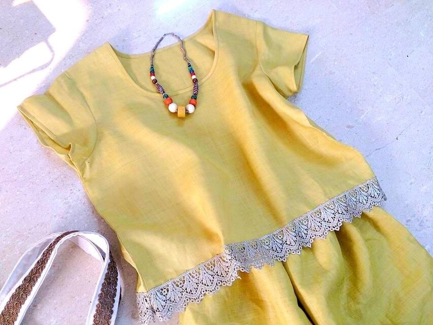 ★★ インドの黄土色、イエローカーキのリネンでツーピースを作りました★★