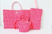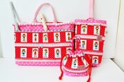 こちらは赤系・女の子柄生地とピンクの★柄生地を組み合わせています。裏地ピンク苺柄生地で作ったレッスンバッグ・シューズケース・ミニ巾着の3点セットになっています。とっても目を引くカラフルポップなカワイイ~セットになっています。新入園・入学のセットやプレゼントとしていかがでしょうか♪