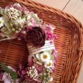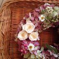 ミナズキのなんとも愛らしい頬色にバラの白さが映えるリースです。