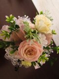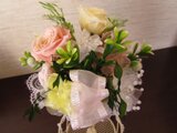 パステルカラーのローズのプリザーブドを中心に、パステルカラーのシルクフラワーや光沢のあるリボンをたっぷりと使い、柔らかい印象に。パールワイヤーなども絡ませ、優雅な仕上がりにしました♪