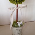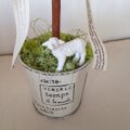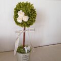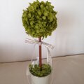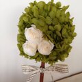 ブリキのバケツにニョキッと生えた、プリザーブドフラワーのグリーンアジサイと白バラのトピアリーです。