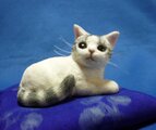 軽量粘土で作った猫さんを白の正絹縮緬でくるみしましましっぽのサバ白模様をつけました。