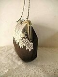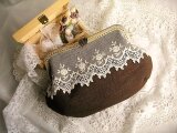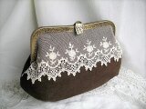 チョコレートブラウンリネンにアンティークレースをのせたがま口バッグ