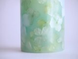 黄緑・パステルグリーン・緑・水色・白のプリザーブドフラワーの紫陽花を入れ、淡い緑色を基調とした透明感・光沢のあるキャンドルです。