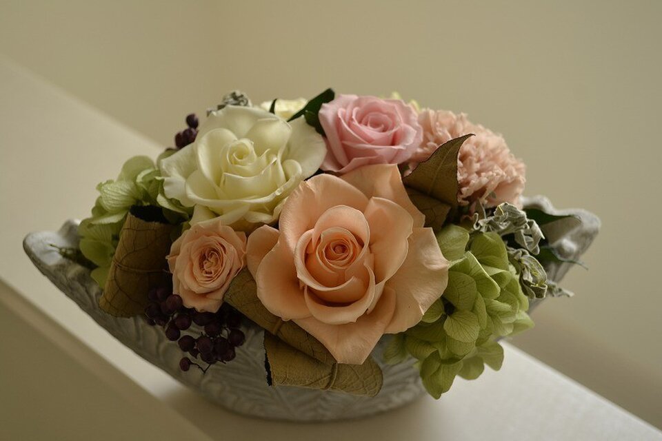 また、こちらのアレンジメントは乾燥等によりモスが散ることや多湿により色落ちすることがございます。ご了承ください。