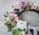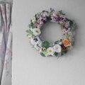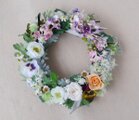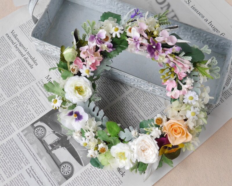 アーティフィシャルフラワーのライラックをリースを上側にバラやラナンキュラスを下側に配置しました。淡いホワイト〜ピンク〜パープルの優しい色合いです。