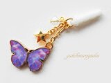 紫色の蝶をメインに小さな星とグラスビーズが揺れるイヤホンジャックアクセサリー(スマホピアス)です。
