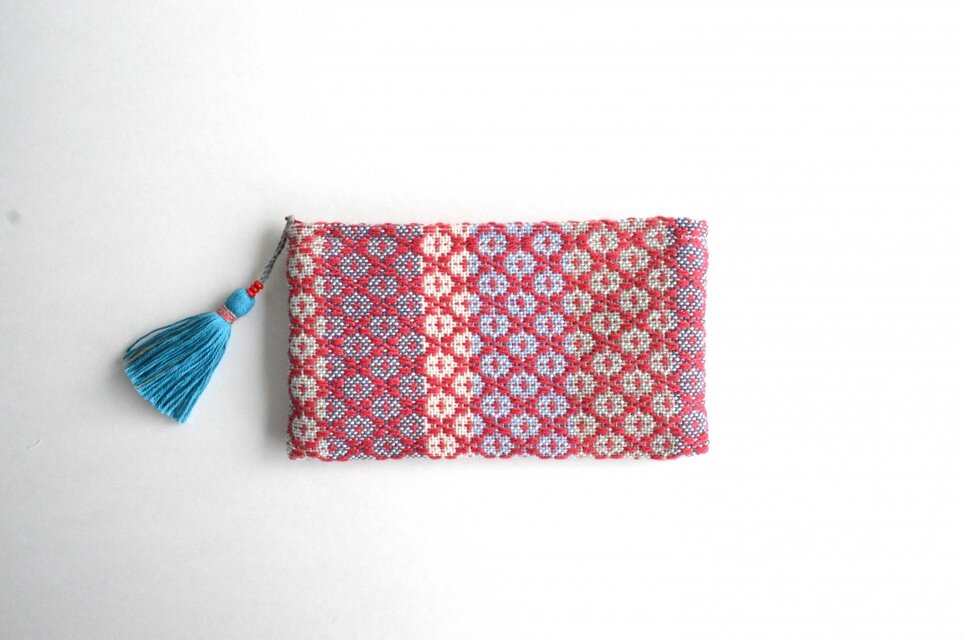 伝統的な柄を元に、オリジナルな要素を加え織ったポーチです。