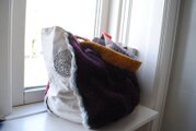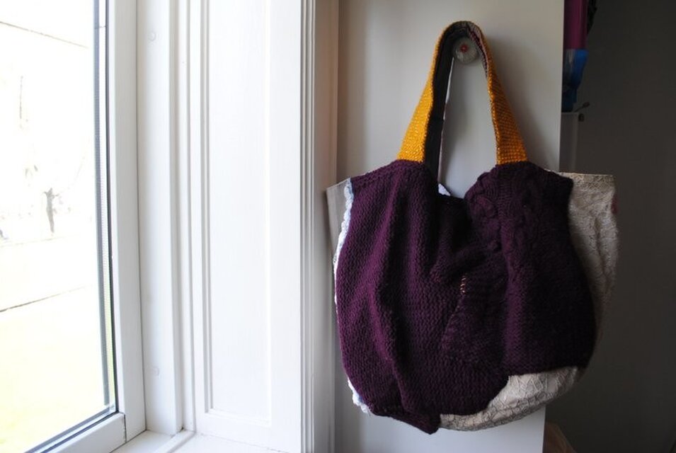 厚手のセーター地を使用しています。手の込んだ模様編みが必見。濃い紫色のセーター地です。