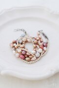 シルクのような光沢とミルキートーン、肌に馴染む愛おしさのバロックパールとグレイッシュオレンジのパール。パイライトやリバーストーンがちいさなスパイスになって、そこまで来ているあたらしい季節の光を纏ったかのよう。