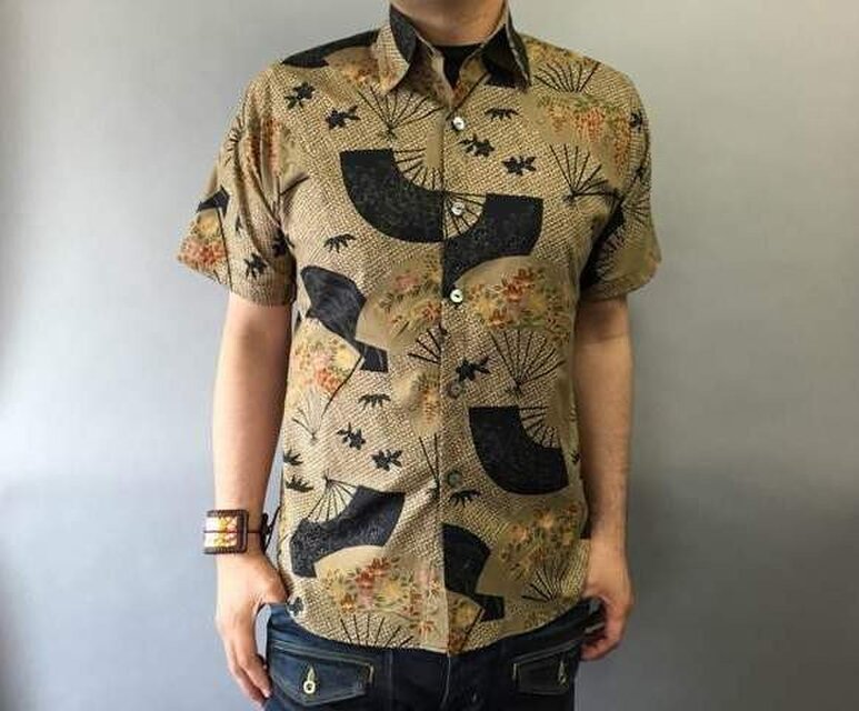 柔らかい生地に鹿の子模様に扇が描かれた粋なシャツ。