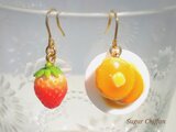 コロンと可愛いイチゴと、ツヤツヤのシロップがたっぷりかかった、本物そっくりで美味しそうなホットケーキを、小さなピアスにしました.☆.。.:*・゚
