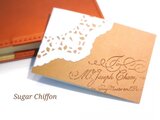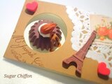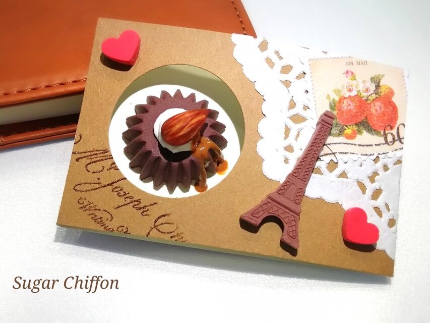 ナチュラルブラウンのカードに、レースペーパー・切手風のマスキングテープ・英文字スタンプ・エッフェル塔チョコと2つのハートでアンティーク風にデコレーションしました。