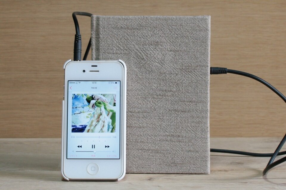 小型のアンプとスピーカーを、ハードカバーの本のようなケースに組み込みました。