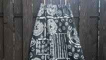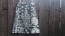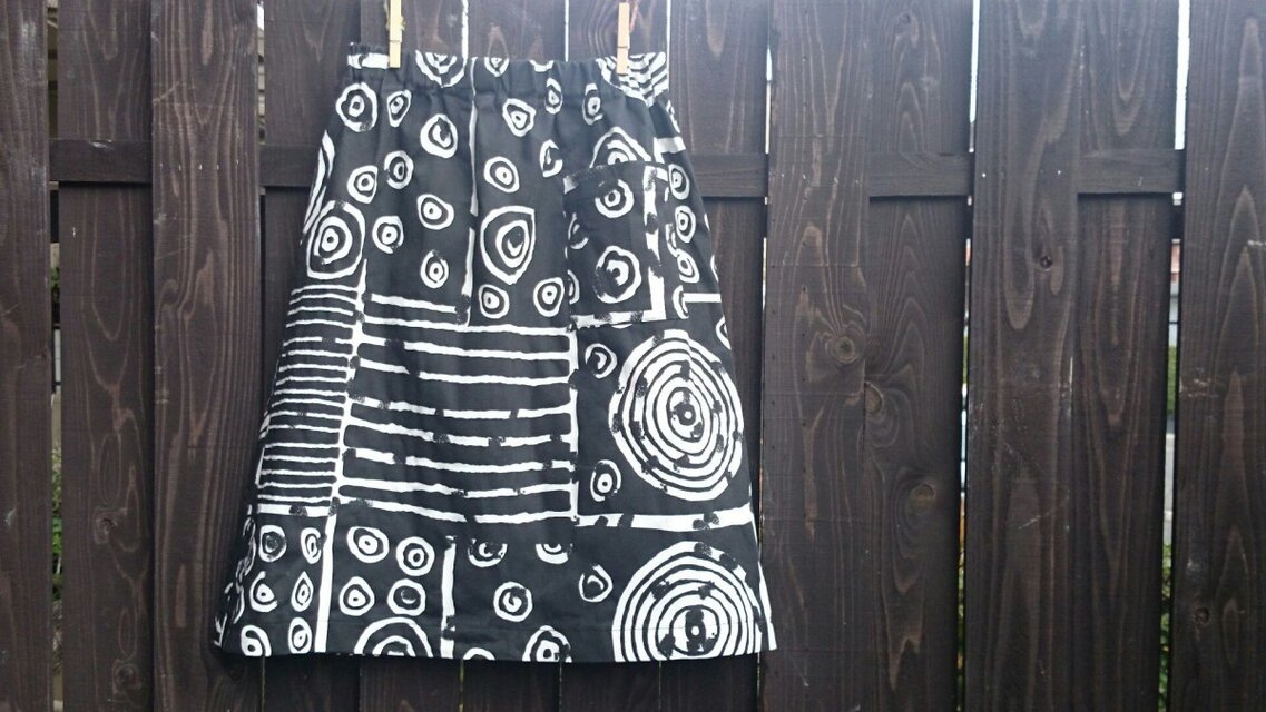 ポップな柄のストレッチデニムのAラインギャザースカートです。