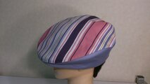 綿のグラデーションストライプ柄をトップに、サイドには柄の一色を取ってグレーがかった薄いパープルの光沢のある綿無地を組合せました。