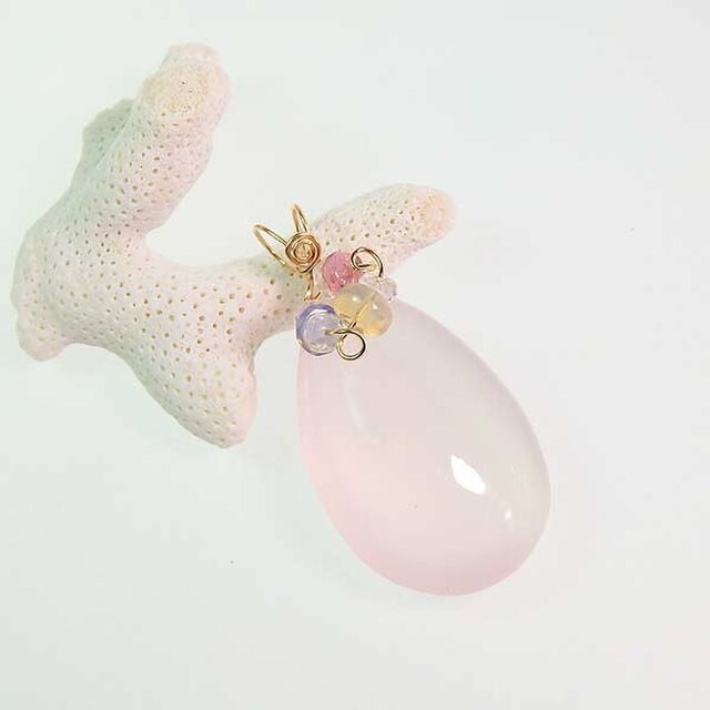 透明感のある優しいピンク色が魅力的なローズクォーツに小粒ビーズを飾り付けた可愛らしいペンダントトップです。