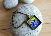 トップのサイズは28×28mm。亜鉛合金製アンティークゴールド色の深さのあるお皿に、アクリル絵具で描いた原画を接着し装飾後、レジンを流し込んでいます。