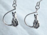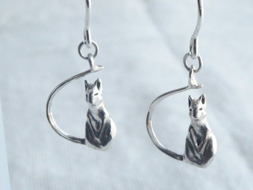 月にちょこんと座っているちっちゃな猫の手作りシルバーイヤリングです。