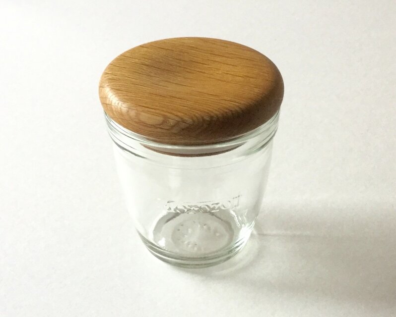 厚手のガラスで捨てるのはもったいない、モロゾフのロゴもカワイイし何かに利用できないかと思いwood capを作ってみました。キャニスターや調味料入れなどキャップを付けると色々使い方が広がります。(昔のタイプのガラス容器も使えます。)
