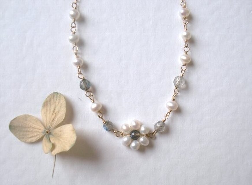 Ohanaブレスレット(Gray)は、角度によって青く輝くラブラドライトのカット石をパールで囲み、小さなお花に仕立てています。大人っぽくて愛らしいお花です。色が白とグレーなので服を選ばず普段に身につけて頂けるかと思います。同じラブラドライトとパールでつないでブレスレットにしています。