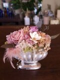 アンティーク調のエレガントな雰囲気の器に、大人なピンクのローズ、ベージュピンクのアジサイなどを合わせました。羽やレースのふんわりと柔らかなイメージををプラスしてくれます。